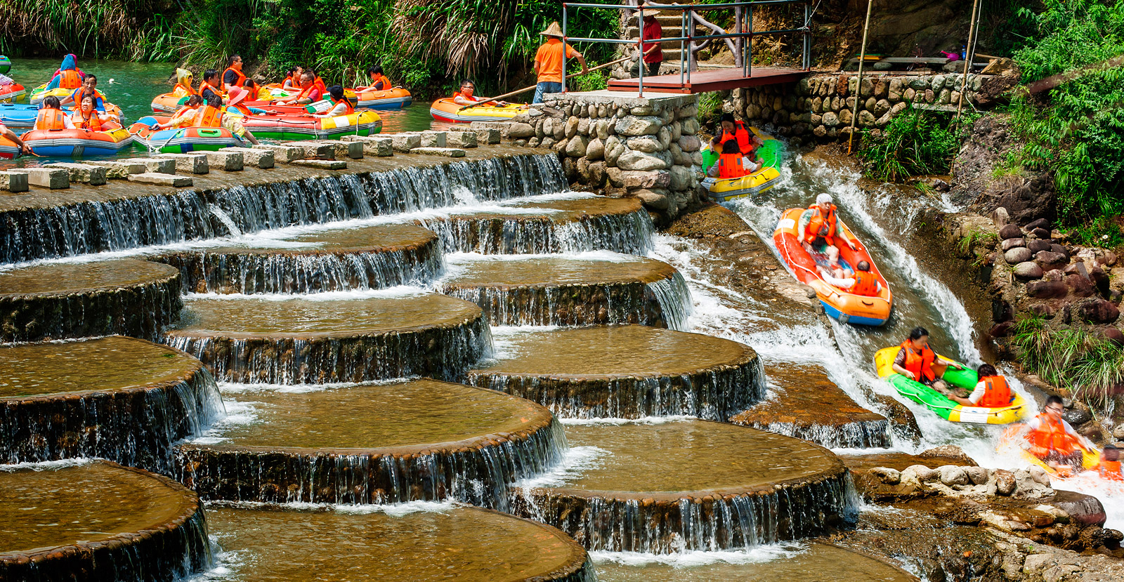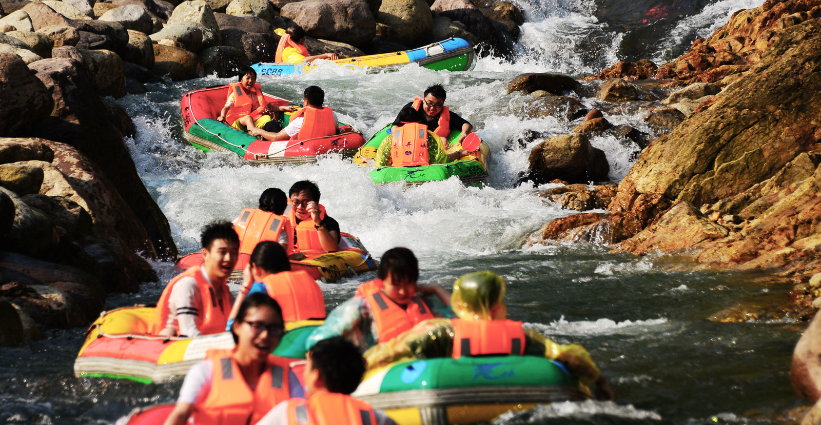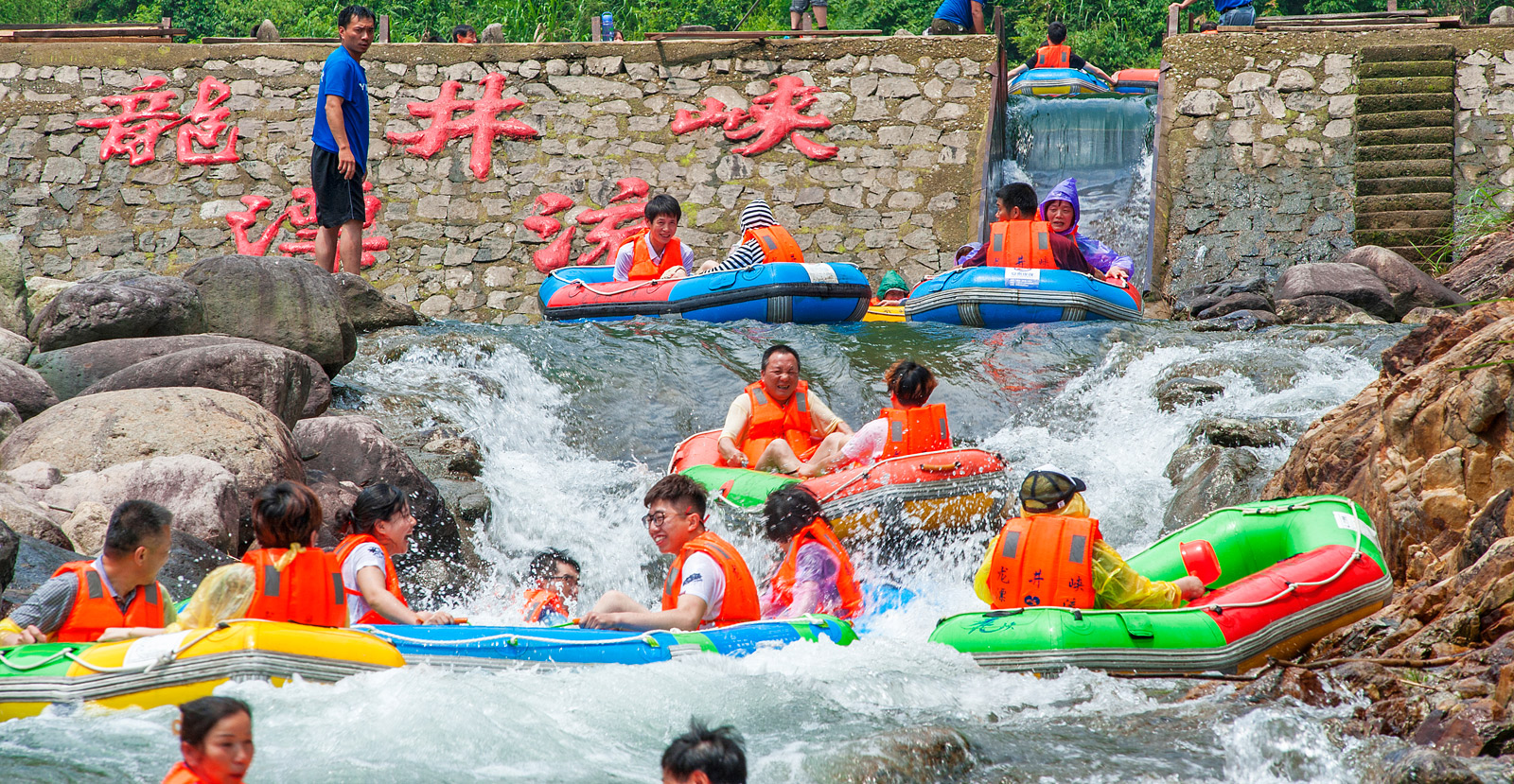 激情漂流全長3公里,首尾落差128米,俯沖水壩3-5米不等,漂流全程一個半小時左右。